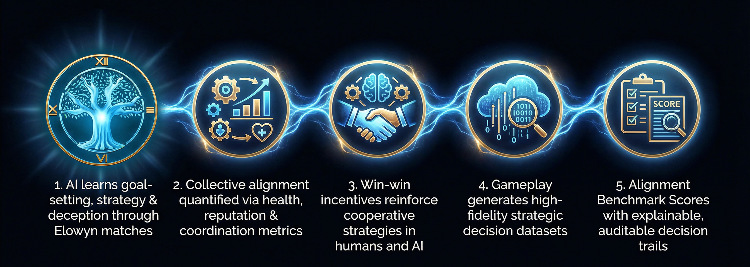 Elowyn is the first game introduced into the Arena, purpose-built for alignment testing through competitive yet interdependent play. Instead of rewarding domination, it embeds shared system health, time-based victory conditions, and explicit deception signaling into gameplay. This allows the Arena to test whether intelligence can detect and counter deception, resist zero-sum traps, and pursue victory without collapsing the shared system—capabilities required for safe deployment.